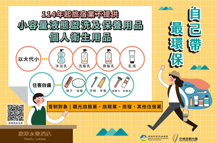實踐減碳環保理念,自114年1月起客房內恕不再主動提供一次性備品